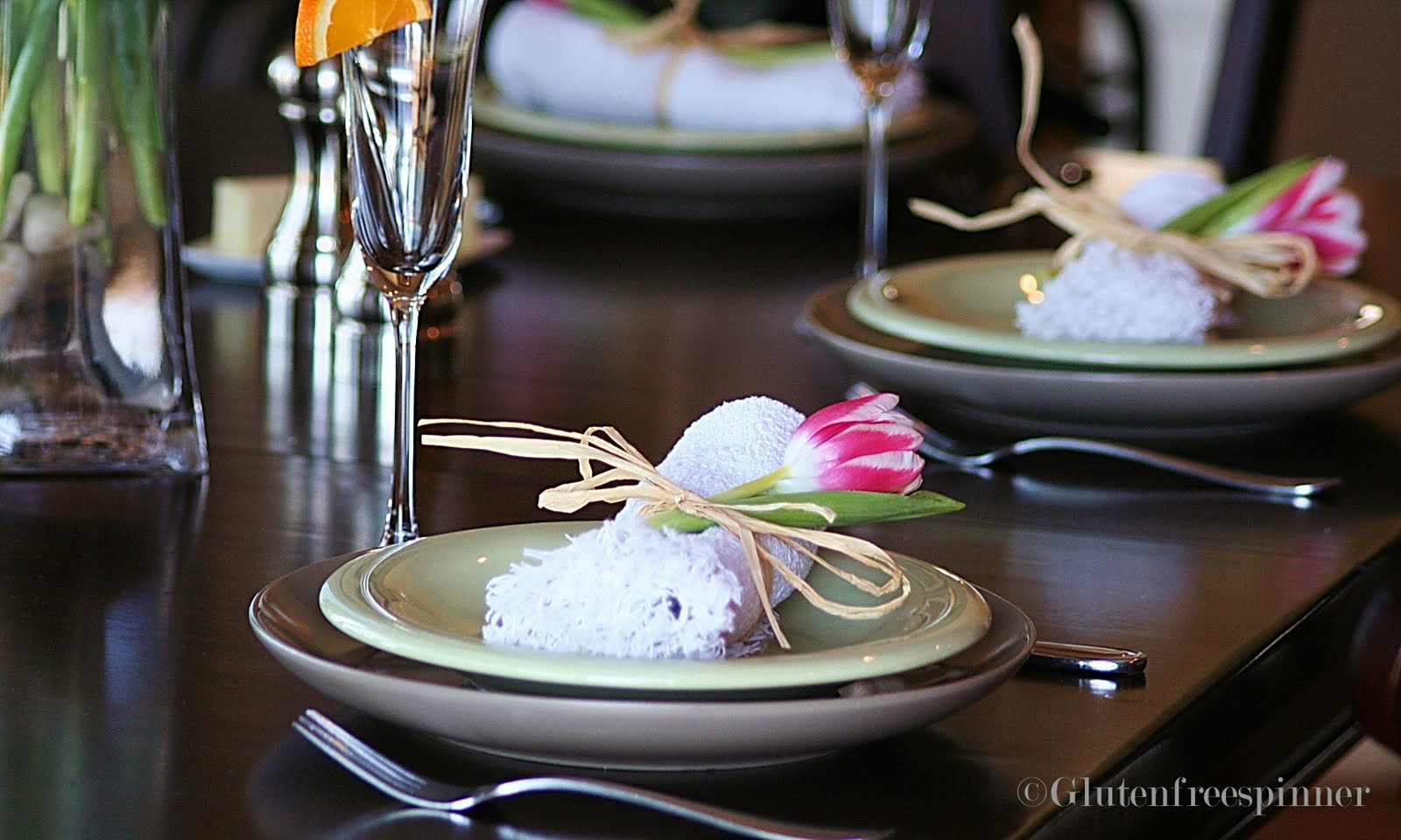 Easy ways to include a theme color are in the napkins, ribbons, and of course the centerpiece. Be creative, the colors are the key and you can include any item as long as they are small enough not to overpower the place setting.